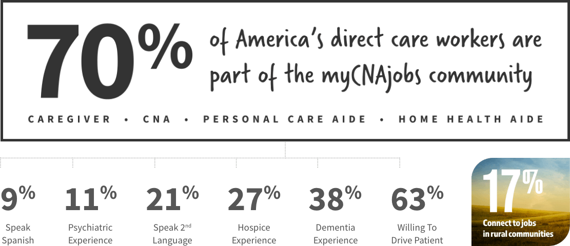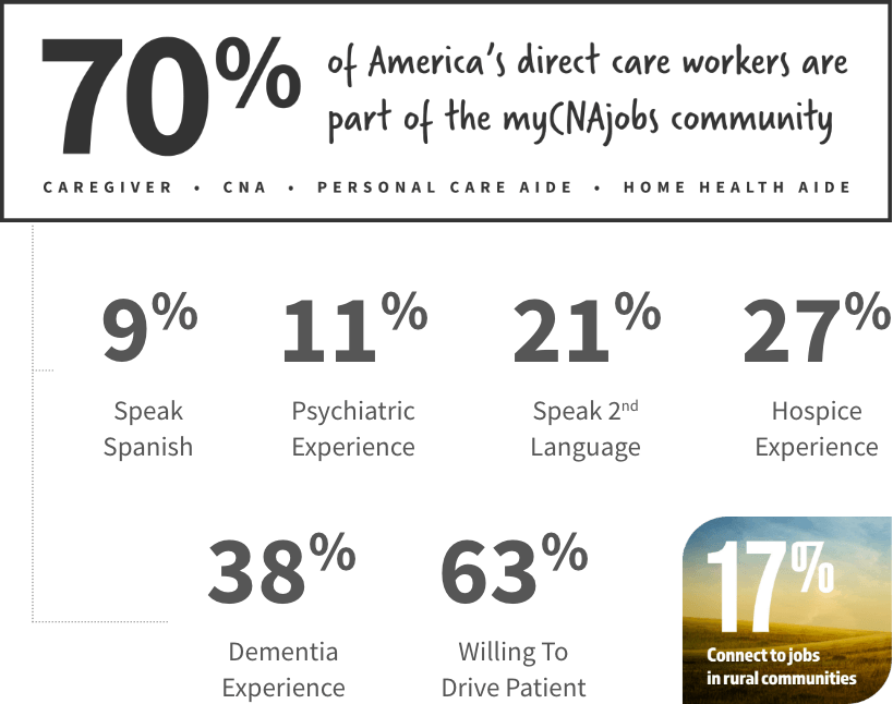 A faith-based organization, dedicated to serving the needs of direct care workers and America’s most vulnerable population. For caregivers, myCNAjobs is a source of free training, job placement and career connection tools. For thousands of companies, myCNAjobs delivers a suite of hiring, engagement, and training tools to drive high-volume hiring.